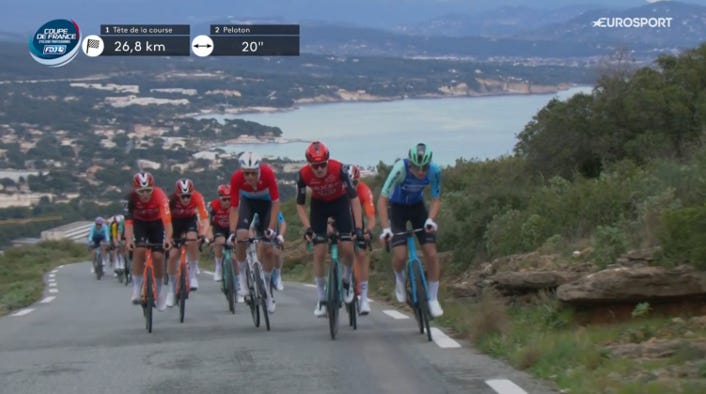 The ’quirks’ in pro cycling much of the time are as unintelligible to seasoned supporters as they would be to anyone stumbling across the sport for the first time. Things that just shouldn’t happen. Shouldn’t be ALLOWED to happen. Or things that simply occur as a by-product of a sport which takes place on public thoroughfares, using the world at large as its arena. However you dress it up, there is no other sport where a horse could join you for a bit of the race (women’s Strade Bianche, 2023), a group of riders could just hang around not knowing exactly where they’re supposed to go at a given moment (Tour de Romandie 2023 I think?) or Derek Gee could be pictured in multiple years riding alongside a man carrying a taxidermy fox (the Giro d’Italia).